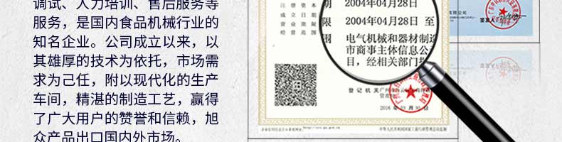 廣州旭眾食品機(jī)械有限公司是一家集科研開發(fā),生產(chǎn)設(shè)計(jì),營銷服務(wù)為一體的現(xiàn)代化生產(chǎn)企業(yè)?,F(xiàn)代化生產(chǎn)車間,精湛制造技術(shù),所產(chǎn)機(jī)械歷經(jīng)市場(chǎng)重重考驗(yàn),不斷贏得海內(nèi)外客戶的贊譽(yù)。