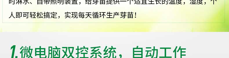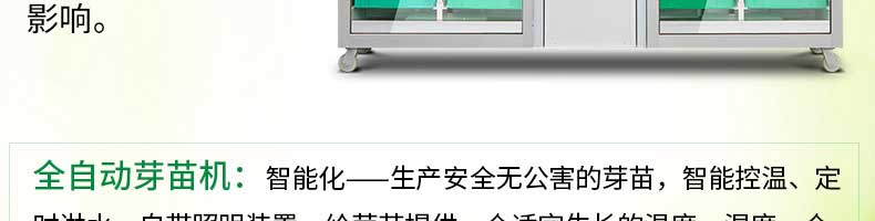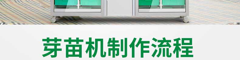 芽苗機系列,全自動芽苗機:智能化一生產安全無公害的芽苗,智能控溫、定時淋水、自帶照明裝置,給芽苗提供一個適宜生長的溫度,濕度,個人即可輕松搞定,實現每天循環(huán)生產芽苗!